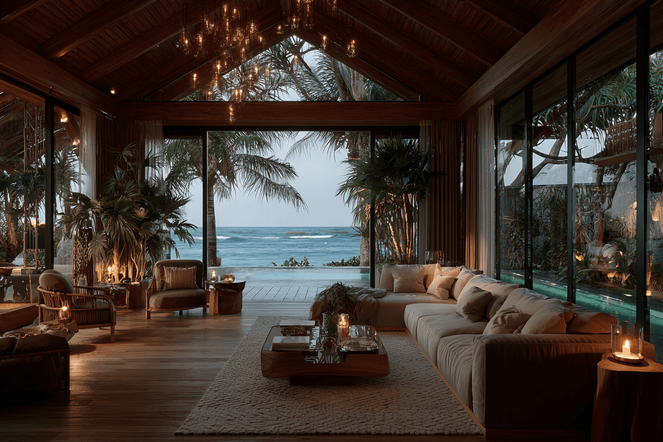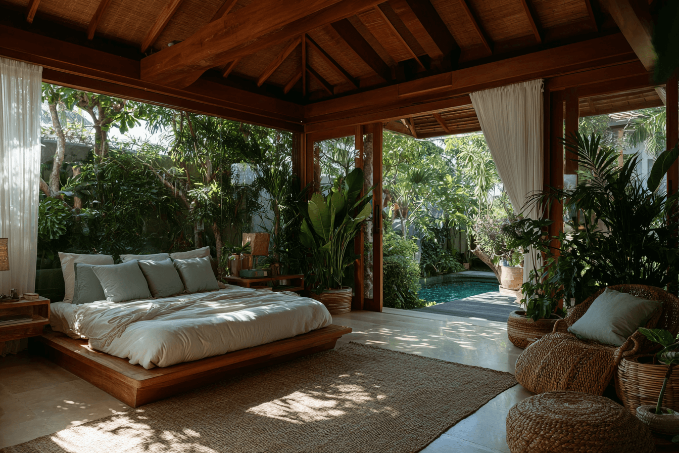 The living room, conceived as a vast tropical lounge, opens widely onto the surrounding landscape with its high wooden structures and generous transparency. Every space radiates tranquility, from the bedroom embraced by greenery to the poolside lounge corner designed for contemplation.