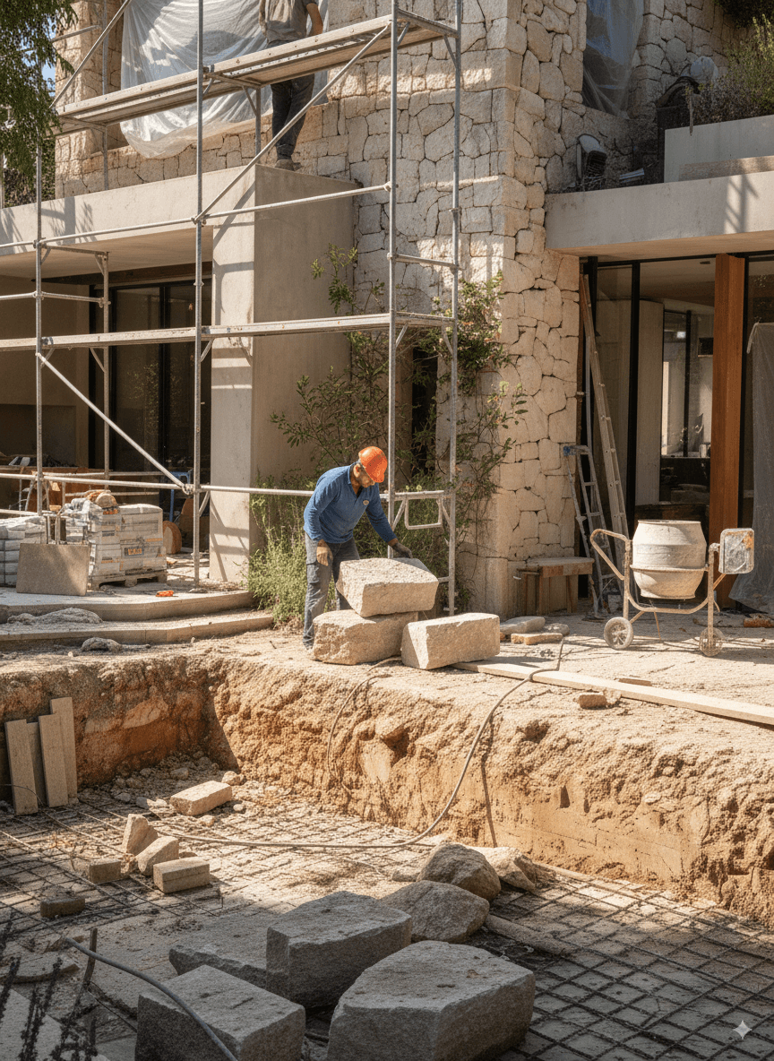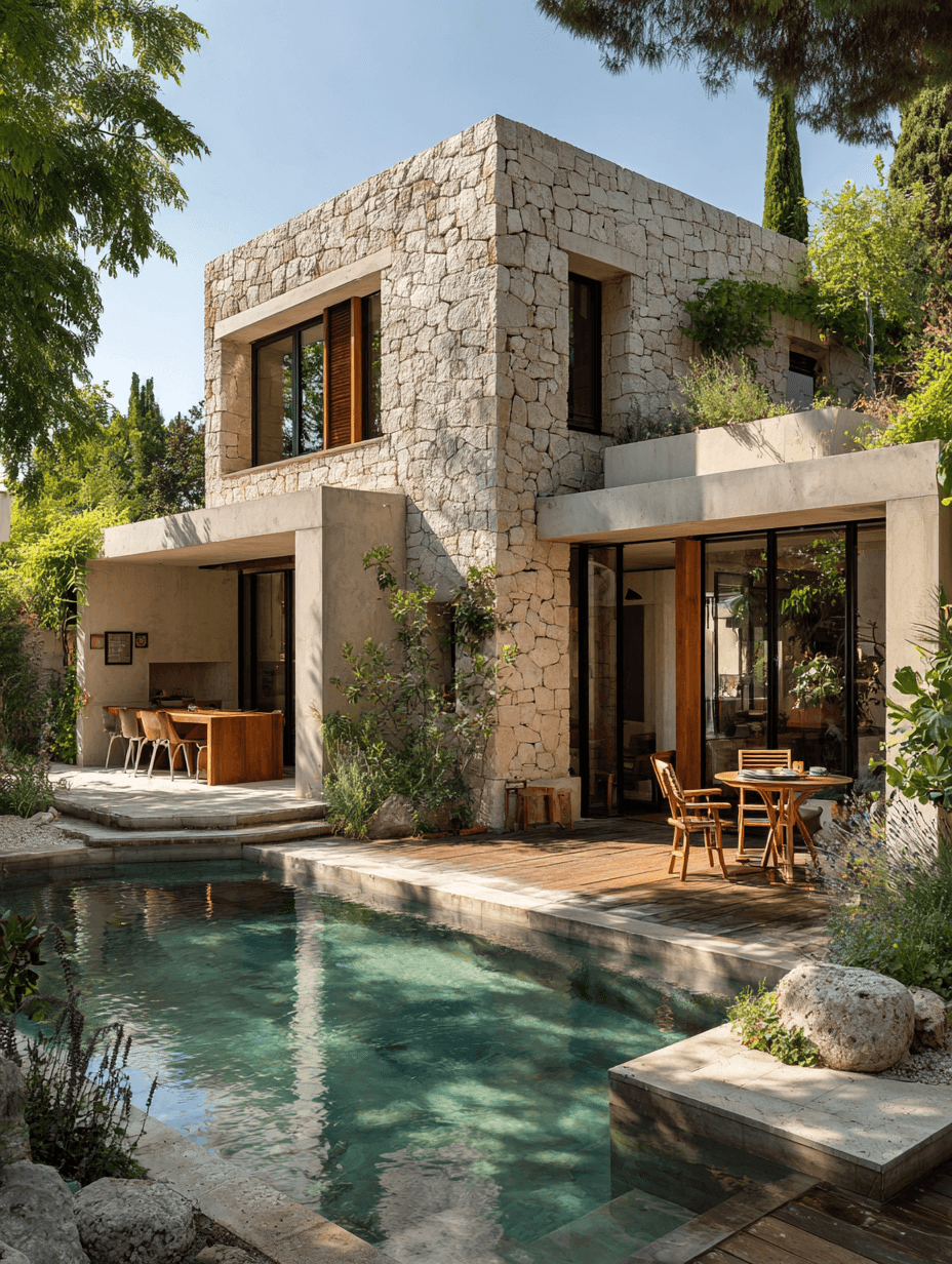 Defined by geometric volumes and generous openings, the villa fosters a seamless relationship between indoor and outdoor living. The façades, alternating between stone and raw concrete, express both robustness and refinement, in perfect harmony with the surrounding landscape.