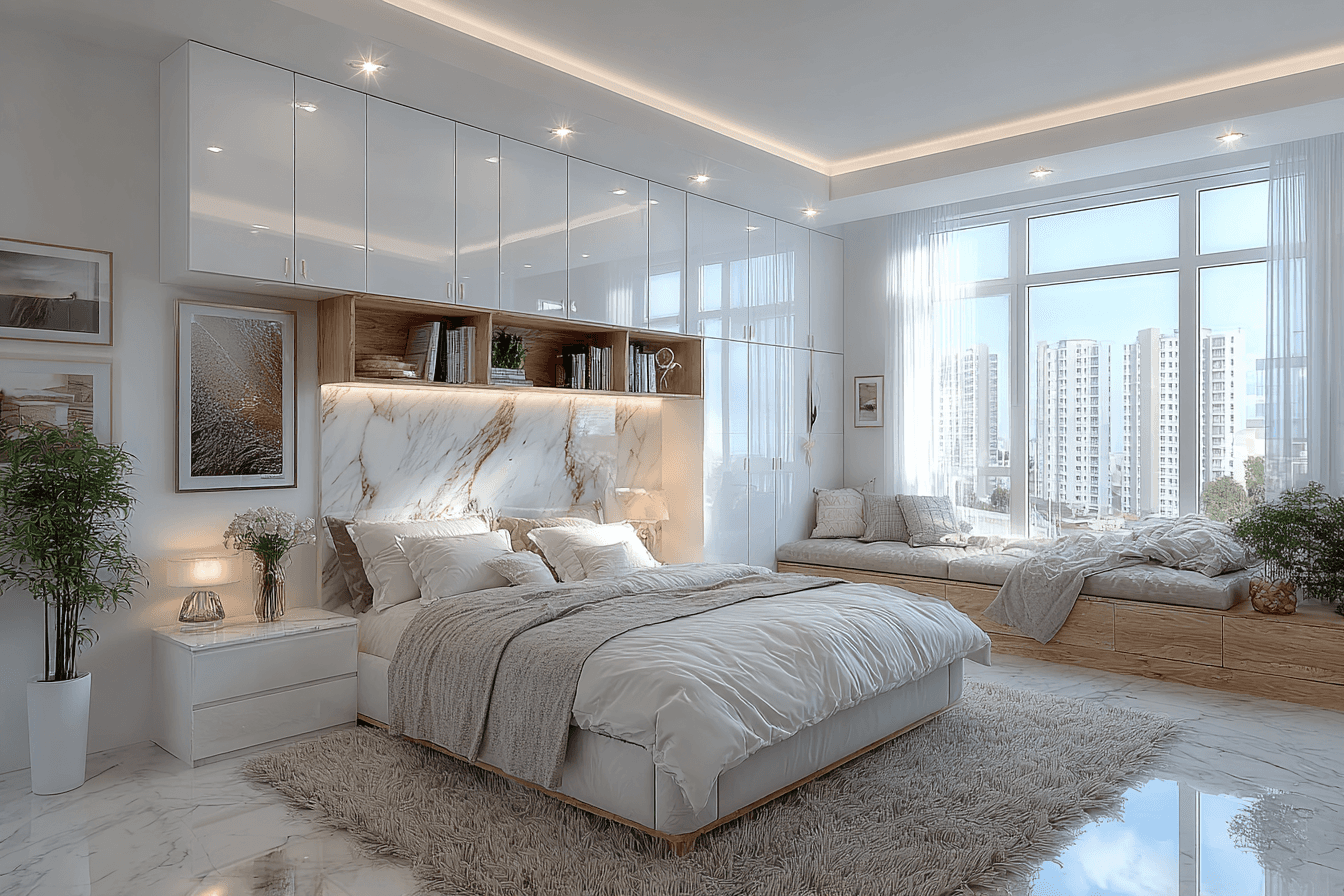 The master bedroom stands out for its soft and calming atmosphere, dominated by light tones and refined materials. Marble, featured on both the headboard and the flooring, is paired with custom-made glossy white cabinetry, creating an aesthetic that is both functional and sophisticated. Large bay windows flood the room with natural light, offering open views over the city and reinforcing the sense of tranquility.