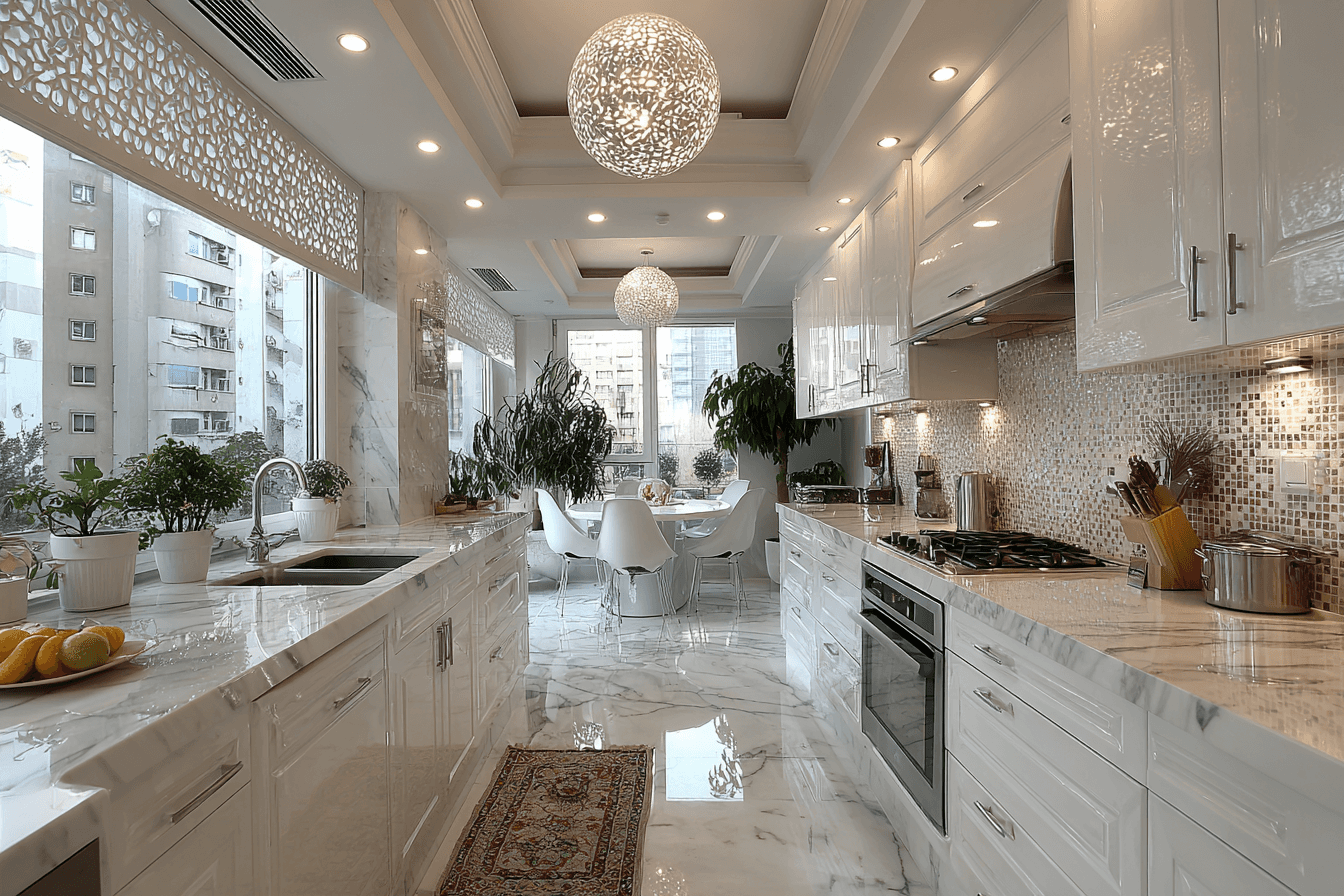 Entirely reimagined, the kitchen opens onto a spacious, luminous area. White marble, running from the flooring to the countertops, blends with glossy cabinetry and carefully designed lighting, giving the space a prestigious yet welcoming character. Designed for hosting and sharing, it combines modern functionality with timeless elegance.